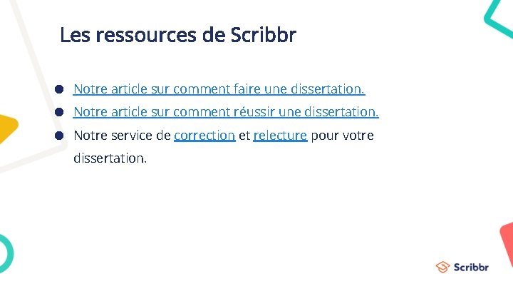Les ressources de Scribbr ● Notre article sur comment faire une dissertation. ● Notre article sur comment réussir une dissertation. ● Notre service de correction et relecture pour votre dissertation.
