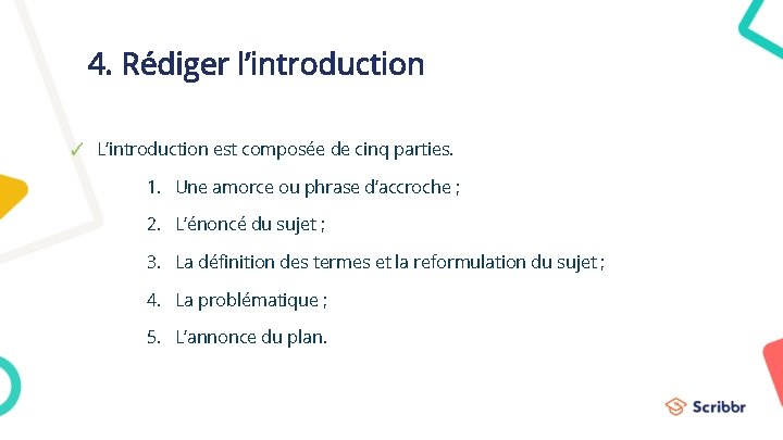 4. Rédiger l’introduction ✓ L’introduction est composée de cinq parties. 1. Une amorce ou phrase d’accroche ; 2. L’énoncé du sujet ; 3. La définition des termes et la reformulation du sujet ; 4. La problématique ; 5. L’annonce du plan.