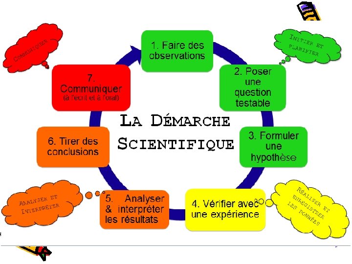 La démarche scientifique 1. Fais des observations 2. Pose une question testable 3. Formule une hypothèse 4. Vérifie (ton hypothèse) à l’aide d’une expérience Variables: independante, dépendante et controlées 5. Analyse les données 6. Tire des conclusions 7. Communique tes résultats