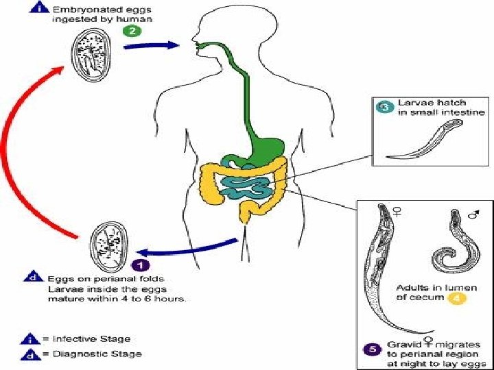 • Les femelles fécondées migrent la nuit vers l'anus où elles pondent leurs œufs, parcourant le côlon jusqu'à la marge anale qu'elles atteignent en principe le soir ou au début de la nuit. • Des milliers d’œufs embryonnés sont alors libérés environ (10 000 œufs/femelle) au niveau des plis radiés de l'anus et sont immédiatement infestants c'est à dire sans attendre une maturation dans le milieu extérieur.