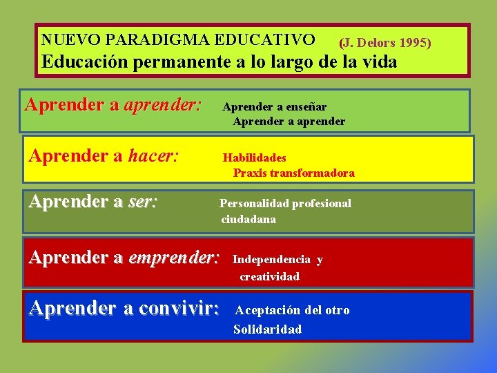 NUEVO PARADIGMA EDUCATIVO (J. Delors 1995) Educación permanente a lo largo de la vida Aprender a aprender: Aprender a enseñar Aprender a aprender Aprender a hacer: Habilidades Praxis transformadora Aprender a ser: Personalidad profesional ciudadana Aprender a emprender: Aprender a convivir: Independencia y creatividad Aceptación del otro Solidaridad