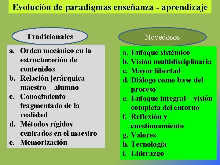 Evolución de paradigmas enseñanza - aprendizaje Tradicionales a. Orden mecánico en la estructuración de contenidos b. Relación jerárquica maestro – alumno c. Conocimiento fragmentado de la realidad d. Métodos rígidos centrados en el maestro e. Memorización Novedosos a. Enfoque sistémico b. Visión multidisciplinaria c. Mayor libertad d. Diálogo como base del proceso e. Enfoque integral – visión completa del entorno f. Reflexión y cuestionamiento g. Valores h. Tecnología i. Liderazgo