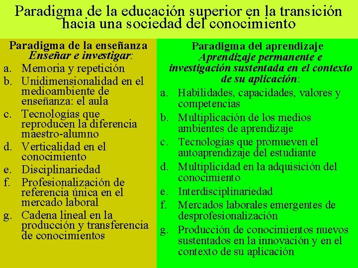 Paradigma de la educación superior en la transición hacia una sociedad del conocimiento Paradigma de la enseñanza Enseñar e investigar: a. Memoria y repetición b. Unidimensionalidad en el medioambiente de enseñanza: el aula c. Tecnologías que reproducen la diferencia maestro-alumno d. Verticalidad en el conocimiento e. Disciplinariedad f. Profesionalización de referencia única en el mercado laboral g. Cadena lineal en la producción y transferencia de conocimientos Paradigma del aprendizaje Aprendizaje permanente e investigación sustentada en el contexto de su aplicación: a. Habilidades, capacidades, valores y competencias b. Multiplicación de los medios ambientes de aprendizaje c. Tecnologías que promueven el autoaprendizaje del estudiante d. Multiplicidad en la adquisición del conocimiento e. Interdisciplinariedad f. Mercados laborales emergentes de desprofesionalización g. Producción de conocimientos nuevos sustentados en la innovación y en el contexto de su aplicación