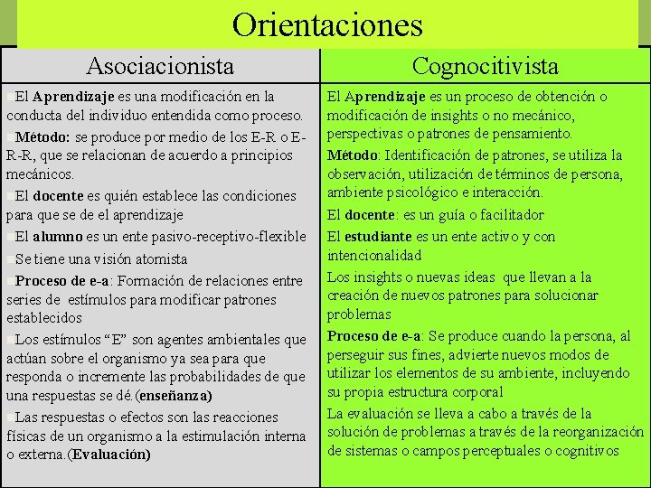 Orientaciones Asociacionista Cognocitivista Aprendizaje es una modificación en la conducta del individuo entendida como proceso. n. Método: se produce por medio de los E-R o ER-R, que se relacionan de acuerdo a principios mecánicos. n. El docente es quién establece las condiciones para que se de el aprendizaje n. El alumno es un ente pasivo-receptivo-flexible n. Se tiene una visión atomista n. Proceso de e-a: Formación de relaciones entre series de estímulos para modificar patrones establecidos n. Los estímulos “E” son agentes ambientales que actúan sobre el organismo ya sea para que responda o incremente las probabilidades de que una respuestas se dé. (enseñanza) n. Las respuestas o efectos son las reacciones físicas de un organismo a la estimulación interna o externa. (Evaluación) El Aprendizaje es un proceso de obtención o modificación de insights o no mecánico, perspectivas o patrones de pensamiento. Método: Identificación de patrones, se utiliza la observación, utilización de términos de persona, ambiente psicológico e interacción. El docente: es un guía o facilitador El estudiante es un ente activo y con intencionalidad Los insights o nuevas ideas que llevan a la creación de nuevos patrones para solucionar problemas Proceso de e-a: Se produce cuando la persona, al perseguir sus fines, advierte nuevos modos de utilizar los elementos de su ambiente, incluyendo su propia estructura corporal La evaluación se lleva a cabo a través de la solución de problemas a través de la reorganización de sistemas o campos perceptuales o cognitivos n. El