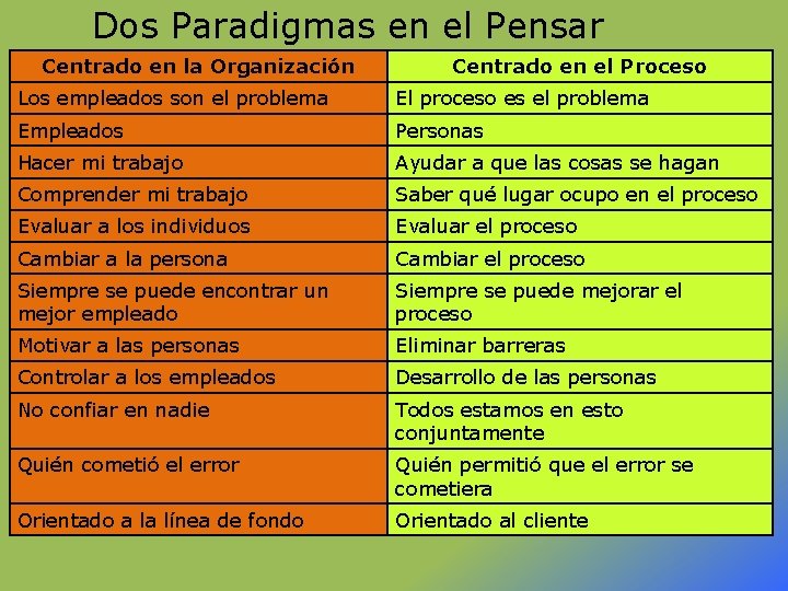 Dos Paradigmas en el Pensar Centrado en la Organización Centrado en el Proceso Los empleados son el problema El proceso es el problema Empleados Personas Hacer mi trabajo Ayudar a que las cosas se hagan Comprender mi trabajo Saber qué lugar ocupo en el proceso Evaluar a los individuos Evaluar el proceso Cambiar a la persona Cambiar el proceso Siempre se puede encontrar un mejor empleado Siempre se puede mejorar el proceso Motivar a las personas Eliminar barreras Controlar a los empleados Desarrollo de las personas No confiar en nadie Todos estamos en esto conjuntamente Quién cometió el error Quién permitió que el error se cometiera Orientado a la línea de fondo Orientado al cliente