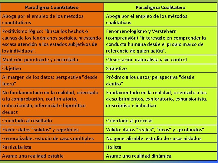 Paradigma Cuantitativo Paradigma Cualitativo Aboga por el empleo de los métodos cuantitativos Aboga por el empleo de los métodos cualitativos Positivismo lógico: "busca los hechos o causas de los fenómenos sociales, prestando escasa atención a los estados subjetivos de los individuos". Fenomenologismo y Verstehern (comprensión) "interesado en comprender la conducta humana desde el propio marco de referencia de quien actúa". Medición penetrante y controlada Observación naturalista y sin control Objetivo Subjetivo Al margen de los datos; perspectiva "desde fuera" Próximo a los datos; perspectiva "desde dentro" No fundamentado en la realidad, orientado a la comprobación, confirmatorio, reduccionista, inferencial e hipotético deduct Fundamentado en la realidad, orientado a los descubrimientos, exploratorio, expansionista, descriptivo e inductivo Orientado al resultado Orientado al proceso Fiable: datos "sólidos" y repetibles Válido: datos "reales", "ricos" y «profundos" Generalizable: estudio de casos múltiples No generalizable: estudio de casos aislados Particularista Holista Asume una realidad estable Asume una realidad dinámica