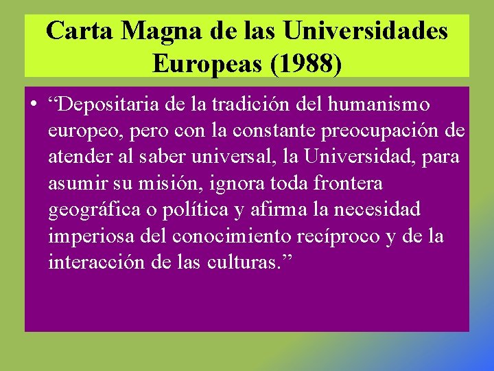 Carta Magna de las Universidades Europeas (1988) • “Depositaria de la tradición del humanismo europeo, pero con la constante preocupación de atender al saber universal, la Universidad, para asumir su misión, ignora toda frontera geográfica o política y afirma la necesidad imperiosa del conocimiento recíproco y de la interacción de las culturas. ”