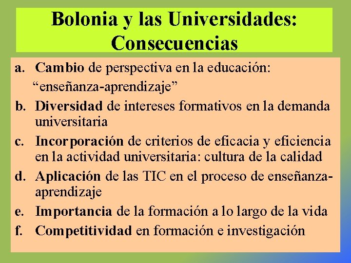 Bolonia y las Universidades: Consecuencias a. Cambio de perspectiva en la educación: “enseñanza-aprendizaje” b. Diversidad de intereses formativos en la demanda universitaria c. Incorporación de criterios de eficacia y eficiencia en la actividad universitaria: cultura de la calidad d. Aplicación de las TIC en el proceso de enseñanzaaprendizaje e. Importancia de la formación a lo largo de la vida f. Competitividad en formación e investigación