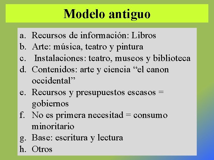 Modelo antiguo a. b. c. d. e. f. g. h. Recursos de información: Libros Arte: música, teatro y pintura Instalaciones: teatro, museos y biblioteca Contenidos: arte y ciencia “el canon occidental” Recursos y presupuestos escasos = gobiernos No es primera necesitad = consumo minoritario Base: escritura y lectura Otros