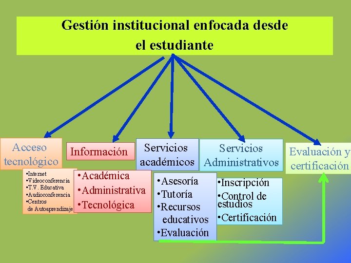 Gestión institucional enfocada desde el estudiante Acceso tecnológico Información • Internet • Videoconferencia • T. V. Educativa • Audioconferencia • Centros de Autoaprendizaje Servicios Evaluación y académicos Administrativos certificación • Académica • Administrativa • Tecnológica • Asesoría • Tutoría • Recursos educativos • Evaluación • Inscripción • Control de estudios • Certificación