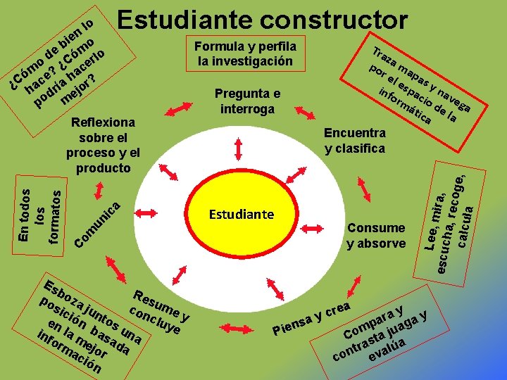 Estudiante constructor Es b Re po oza sum sic ju c onc e y nto i ó luy en n su e b l inf a m as na a or ma ejor da ció n Formula y perfila la investigación Pregunta e interroga Tra z po a ma re l e pas y inf spa na orm cio ve áti de l ga ca a Encuentra y clasifica Estudiante Consume y absorve nsa e i P a e y cr Lee, m ira, escuc ha, re c calcul oge, a En todos los formatos C om un ic a lo n e bi mo de Có rlo o ¿ ce m ó e? ha ? C ¿ hac ría jor d e o m p Reflexiona sobre el proceso y el producto y y a r pa aga m Co sta ju tra valúa n e co