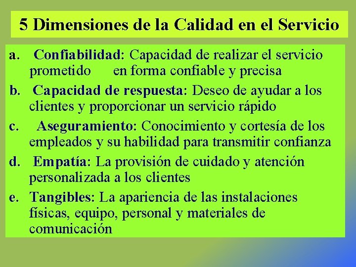 5 Dimensiones de la Calidad en el Servicio a. Confiabilidad: Capacidad de realizar el servicio prometido en forma confiable y precisa b. Capacidad de respuesta: Deseo de ayudar a los clientes y proporcionar un servicio rápido c. Aseguramiento: Conocimiento y cortesía de los empleados y su habilidad para transmitir confianza d. Empatía: La provisión de cuidado y atención personalizada a los clientes e. Tangibles: La apariencia de las instalaciones físicas, equipo, personal y materiales de comunicación