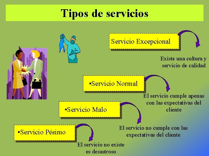Tipos de servicios Servicio Excepcional Existe una cultura y servicio de calidad • Servicio Normal El servicio cumple apenas con las expectativas del cliente • Servicio Malo • Servicio Pésimo El servicio no cumple con las expectativas del cliente El servicio no existe es desastroso