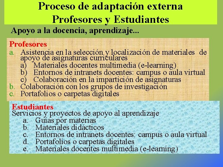 Proceso de adaptación externa Profesores y Estudiantes Apoyo a la docencia, aprendizaje. . . Profesores a. Asistencia en la selección y localización de materiales de apoyo de asignaturas curriculares a) Materiales docentes multimedia (e-learning) b) Entornos de intranets docentes: campus o aula virtual c) Colaboración en la impartición de asignaturas b. Colaboración con los grupos de investigación c. Portafolios o carpetas digitales Estudiantes Servicios y proyectos de apoyo al aprendizaje a. Guías por materias b. Materiales didácticos c. Entornos de intranets docentes: campus o aula virtual d. Portafolios o carpetas digitales e. Materiales docentes multimedia (e-learning)
