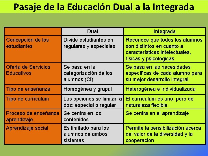 Pasaje de la Educación Dual a la Integrada Dual Integrada Concepción de los estudiantes Divide estudiantes en regulares y especiales Reconoce que todos los alumnos son distintos en cuanto a características intelectuales, físicas y psicológicas Oferta de Servicios Educativos Se basa en la categorización de los alumnos (CI) Se basa en las necesidades específicas de cada alumno para su mejor desarrollo integral Tipo de enseñanza Homogénea y grupal Heterogénea e individualizada Tipo de currículum Las opciones se limitan a El currículum es uno, pero de dos: especial o regular naturaleza flexible Proceso de enseñanza Se centra en los aprendizaje contenidos Se centra en el aprendizaje Aprendizaje social Permite la sensibilización acerca del valor de la diversidad y la cooperación Es limitado para los alumnos de ambos sistemas