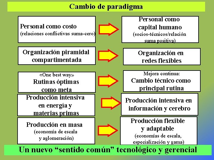 Cambio de paradigma Personal como costo (relaciones conflictivas suma-cero) Personal como capital humano (socios-técnicos/relación suma positiva) Organización piramidal compartimentada Organización en redes flexibles «One best way» Mejora continua: Rutinas óptimas como meta Producción intensiva en energía y materias primas Producción en masa (economía de escala y aglomeración) Cambio técnico como principal rutina Producción intensiva en información y cerebro Producción flexible y adaptable (economías de escala, especialización y gama) Un nuevo “sentido común” tecnológico y gerencial