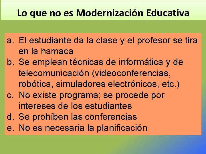 Lo que no es Modernización Educativa a. El estudiante da la clase y el profesor se tira en la hamaca b. Se emplean técnicas de informática y de telecomunicación (videoconferencias, robótica, simuladores electrónicos, etc. ) c. No existe programa; se procede por intereses de los estudiantes d. Se prohíben las conferencias e. No es necesaria la planificación