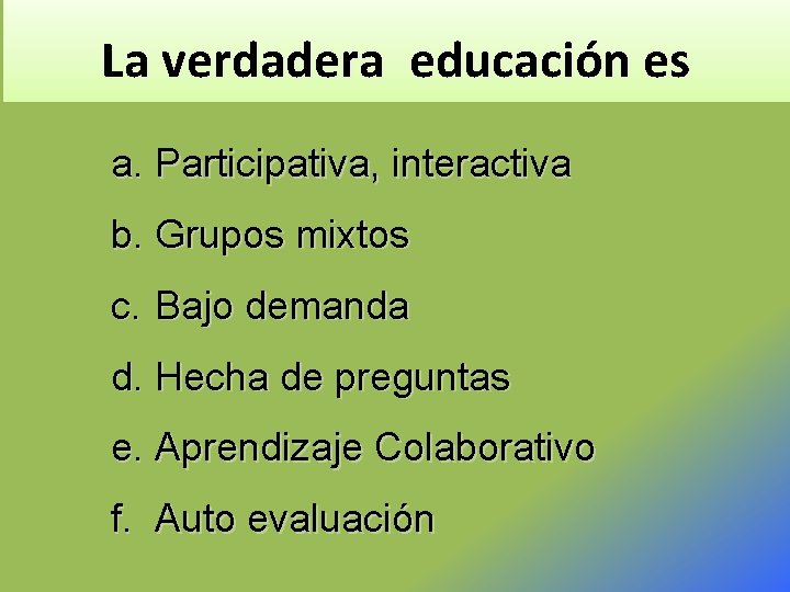 La verdadera educación es a. Participativa, interactiva b. Grupos mixtos c. Bajo demanda d. Hecha de preguntas e. Aprendizaje Colaborativo f. Auto evaluación