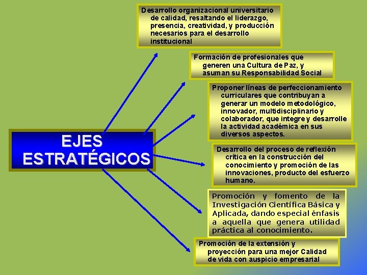 Desarrollo organizacional universitario de calidad, resaltando el liderazgo, presencia, creatividad, y producción necesarios para el desarrollo institucional Formación de profesionales que generen una Cultura de Paz, y asuman su Responsabilidad Social EJES ESTRATÉGICOS Proponer líneas de perfeccionamiento curriculares que contribuyan a generar un modelo metodológico, innovador, multidisciplinario y colaborador, que integre y desarrolle la actividad académica en sus diversos aspectos. Desarrollo del proceso de reflexión crítica en la construcción del conocimiento y promoción de las innovaciones, producto del esfuerzo humano. Promoción y fomento de la Investigación Científica Básica y Aplicada, dando especial énfasis a aquella que genera utilidad práctica al conocimiento. Promoción de la extensión y proyección para una mejor Calidad de vida con auspicio empresarial