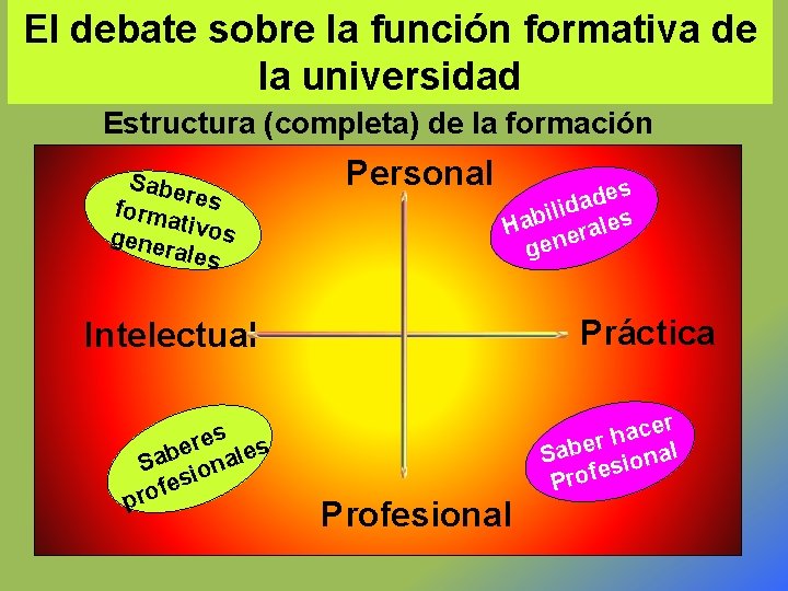 El debate sobre la función formativa de la universidad Estructura (completa) de la formación Sabe r forma es t gene ivos rales Personal es d a ilid es b a H ral e n ge Práctica Intelectual es s r e Sab ionale s e f o pr Profesional er c a h r e b a al S n o i es f o r P