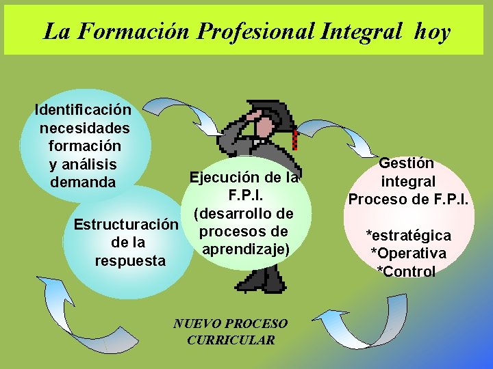 La Formación Profesional Integral hoy Identificación necesidades formación y análisis demanda Ejecución de la F. P. I. (desarrollo de Estructuración procesos de de la aprendizaje) respuesta NUEVO PROCESO CURRICULAR Gestión integral Proceso de F. P. I. *estratégica *Operativa *Control