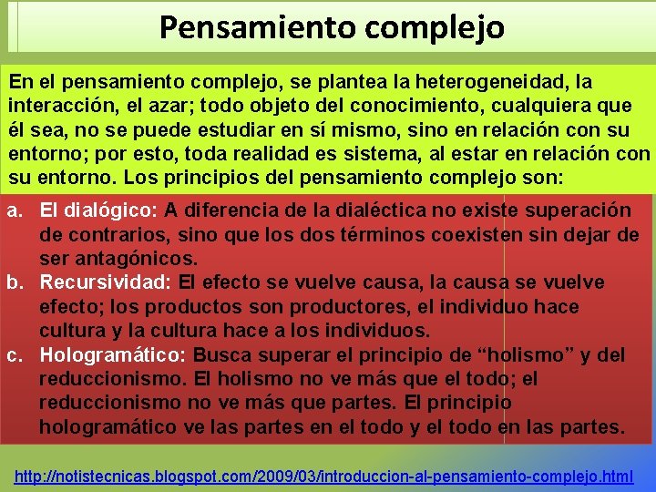 Pensamiento complejo En el pensamiento complejo, se plantea la heterogeneidad, la interacción, el azar; todo objeto del conocimiento, cualquiera que él sea, no se puede estudiar en sí mismo, sino en relación con su entorno; por esto, toda realidad es sistema, al estar en relación con su entorno. Los principios del pensamiento complejo son: a. El dialógico: A diferencia de la dialéctica no existe superación de contrarios, sino que los dos términos coexisten sin dejar de ser antagónicos. b. Recursividad: El efecto se vuelve causa, la causa se vuelve efecto; los productos son productores, el individuo hace cultura y la cultura hace a los individuos. c. Hologramático: Busca superar el principio de “holismo” y del reduccionismo. El holismo no ve más que el todo; el reduccionismo no ve más que partes. El principio hologramático ve las partes en el todo y el todo en las partes. http: //notistecnicas. blogspot. com/2009/03/introduccion-al-pensamiento-complejo. html