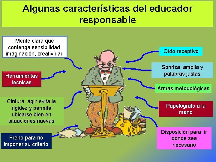 Algunas características del educador responsable Mente clara que contenga sensibilidad, imaginación, creatividad Herramientas técnicas Cintura ágil: evita la rigidez y permite ubicarse bien en situaciones nuevas Freno para no imponer su criterio Oído receptivo Sonrisa amplia y palabras justas Armas metodológicas Papelógrafo a la mano Disposición para ir donde sea necesario