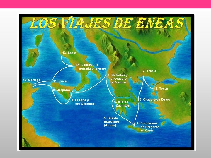 Personajes importantes • Eneas Su padre: Anquises Su hijo: Ascanio Su esposa: Creúsa Algunos troyanos que lo siguen • Dido • Dioses: Venus, Juno, Júpiter, • • Mercurio… Monstruos como Harpías, cíclopes, Escila y Caribdis, la sibila, el Can Cerbero El rey Latino y su hija Lavinia Turno y sus tropas El rey Evandro y sus tropas