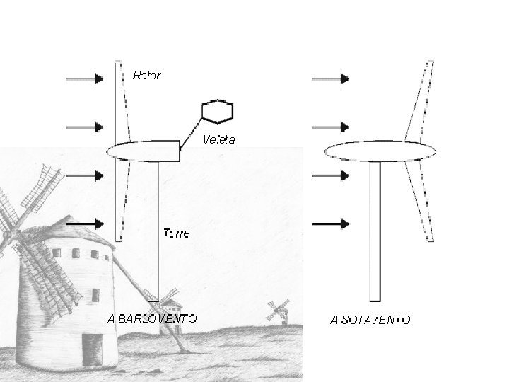 2. Por la orientación respecto al viento: - A barlovento: → Tienen el rotor de cara al viento. → El más habitual. → Necesita un mecanismo de orientación. -A sotavento: → Se mueven con el viento que sale tras la góndola. → Pueden ser construidos sin un mecanismo de orientación. → Rotor puede hacerse más flexible.