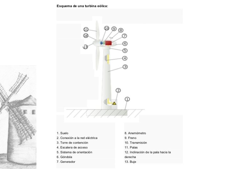 → Cimentación → Torre → Las palas del rotor Caja de cambios Componentes de un aerogenerador Generador → Góndola Sistema de frenado Sistema de control