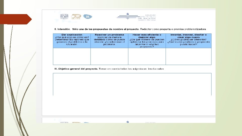 II. Intención. Sólo una de las propuestas da nombre al proyecto. Dar explicación ¿Por qué algo es cómo es? Determinar las razones que generan el problema o la situación. Resolver un problema Explicar de manera detallada cómo se puede abordar y/o solucionar el problema. Hacer más eficiente o mejorar Inventar, innovar, diseñar o crear algo nuevo Explicar de qué manera se ¿Cómo podría ser diferente? pueden optimizar los procesos ¿Qué nuevo producto o propuesta para alcanzar el objetivo. puedo hacer? Plantear la problemática Buscar resolver el problema a través de las diferentes disciplinas involucradas Dar seguimiento por asignatura Elaborar nuevo producto, propuesta o idea (innovar), solucionar un problema, entender profundamente un fenómeno