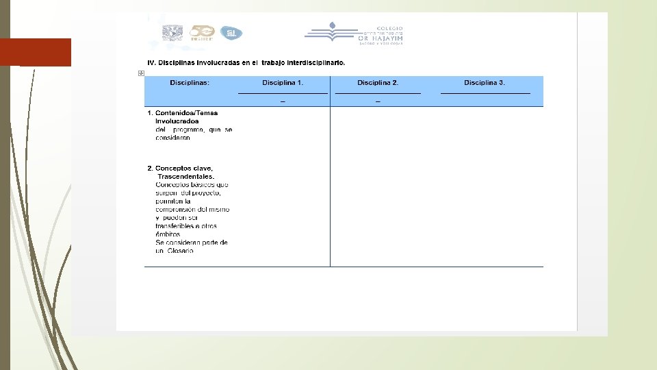 IV. Disciplinas involucradas en el trabajo interdisciplinario. Disciplinas: Disciplina 1. ___Sociología_______ Disciplina 2. Física__________ Disciplina 3. Administración________ 1. Contenidos / Temas involucrados. Temas y contenidos del programa, que se consideran. Identificar elementos propios de la asignatura como el estudio de las sociedades, su comportamiento, los conflictos, guerras, manejo de economía, búsqueda de bienestar social, etc. Analizar fenómenos físicos relacionados con el proyecto. Recurrir el método científico experimental y observar el proceso. Plan de financiamiento y búsqueda de patrocinadores y personal para su ejecución. Planeación, organización, logística y producción. 2. Conceptos clave, trascendentales. Conceptos básicos que surgen del proyecto, permiten la comprensión del mismo y pueden ser transferibles a otros ámbitos. Se consideran parte de un Glosario. *Bienestar *Educación *Conflicto Social * Tiempo, lugar y espacio * Perspectiva *Planeación, organización, logística y producción. *Finanzas