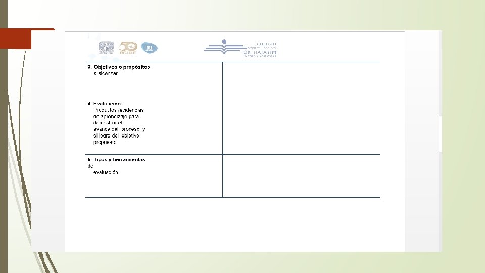 Evaluación Aprendizajes esperados Asignatura 1: ___________ Aspectos a evaluar Instrumentos de evaluación Asignatura 2: ___________ Asignatura 3: ___________