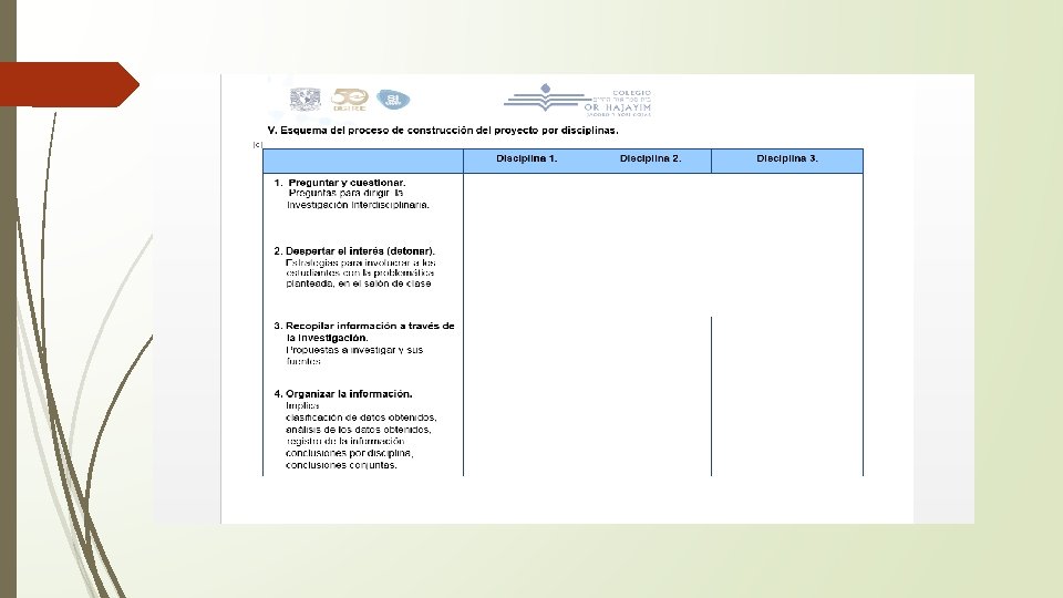 V. Esquema del proceso de construcción del proyecto por disciplinas. Disciplina 1. Disciplina 2. Disciplina 3. 1. Preguntar y cuestionar. Preguntas que dirigen la Investigación Interdisciplinaria. Sociología ¿Cuáles son las características de una sociedad violenta y las relaciones de conflicto que pueden establecerse? Administración ¿Cuáles son los requisitos para el financiamiento de una campaña o proyecto de acción social? ¿Qué opciones existen? Derecho ¿Cuál es la legislación actual en términos de violencia intrafamiliar en México y cómo cambia dentro de la federación? 2. Despertar el interés (detonar). Estrategias para involucrar a los estudiantes con la problemática planteada, en el salón de clase. Se les pidió a los estudiantes que trajeran información sobre la violencia intrafamiliar en México, apoyándose de diversas fuentes: 1. Noticias 2. Definición 3. Impacto 4. Modalidades 5. Estadísticas Podrían traer información en: libros, páginas válidas, estadísticas, videos, campañas, etc. A su vez, se tuvo un testimonio real de una persona que presentó su caso en una conferencia para los alumnos. Los alumnos presentaron y discutieron sobre la realidad de nuestro país en este aspecto y se les indicó que dieran algunas ideas sobre lo que se podría hacer para erradicar esta realidad. Los alumnos se sensibilizaron a tal grado que de inmediato empezaron a idear la campaña. 3. Recopilar información a través de la investigación. Lo que se investiga. Fuentes que se utilizan. Podrían consultar fuentes primarias o elementos editados, pero verificando su vigencia. ¿Cuáles son las características de una sociedad violenta y las relaciones de conflicto que pueden establecerse? Podrían consultar fuentes primarias o elementos editados, pero verificando su vigencia. ¿Cuáles son los requisitos para el financiamiento de una campaña o proyecto de acción social? ¿Qué opciones existen? Podrían consultar fuentes primarias o elementos editados, pero verificando su vigencia. ¿Cuál es la legislación actual en términos de violencia intrafamiliar en México y cómo cambia dentro de la federación?