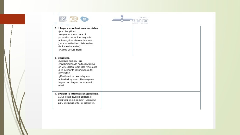 • Si se toma en cuenta lo que se hace generalmente, para el trabajo en clase ¿Qué cambios deben hacerse para generar un proyecto interdisciplinario? • Maestro como primer investigador. • Definir preguntas a partir de conocimientos previos. • Postura del maestro como primer observador. • Establecer conexiones con la misma asignatura y con las otras que participan en el proyecto. • ¿Cómo beneficia al aprendizaje el trabajo interdisciplinario? • El maestro no lo es sólo de asignatura, sino formación y de vida. No solo evaluamos nuestra asignatura, sino también la forma en que los alumnos colaboran con otros, conocen su mundo, confrontan su realidad, se conocen a sí mismos, y adquieren valores, etc. El proyecto nos ayuda a reconocernos no solo como maestros de asignatura, sino como modelo, guía y mediador de este proceso.