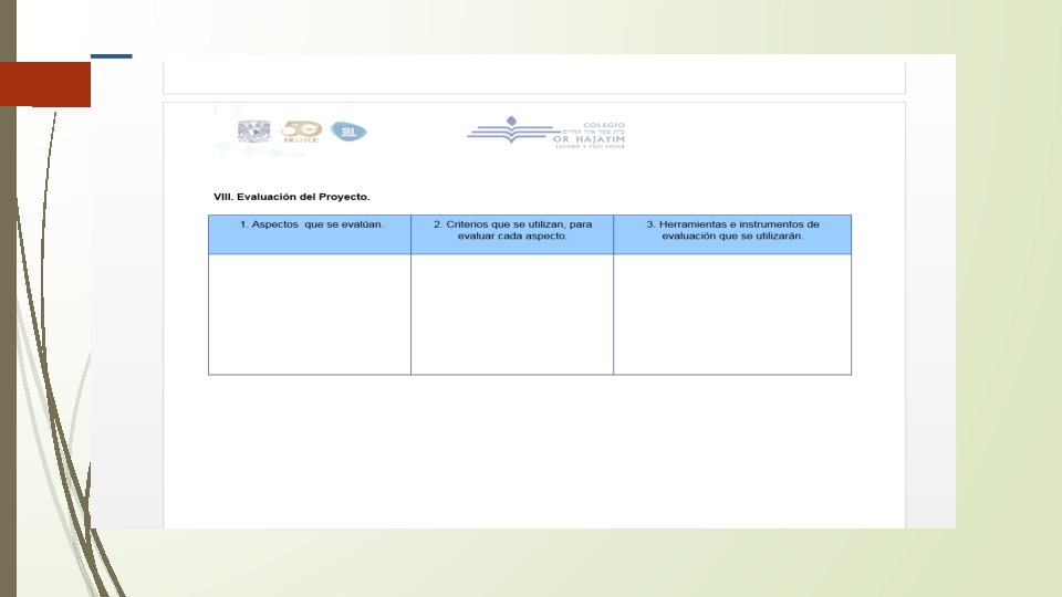 VIII. Evaluación del Proyecto. 1. ¿Qué aspectos se evalúan del proyecto? 2. ¿Cuáles son los criterios que se utilizan para evaluar cada aspecto? 3. Herramientas e instrumentos de evaluación que se utilizan.