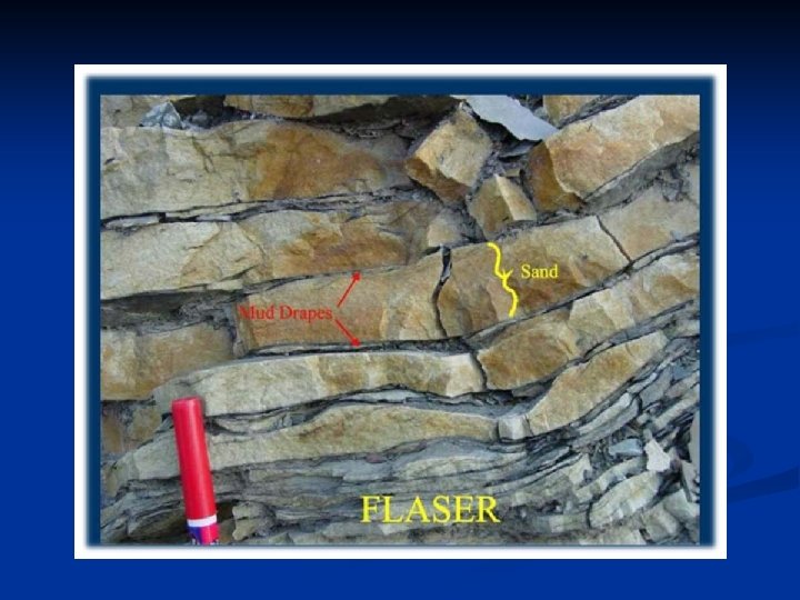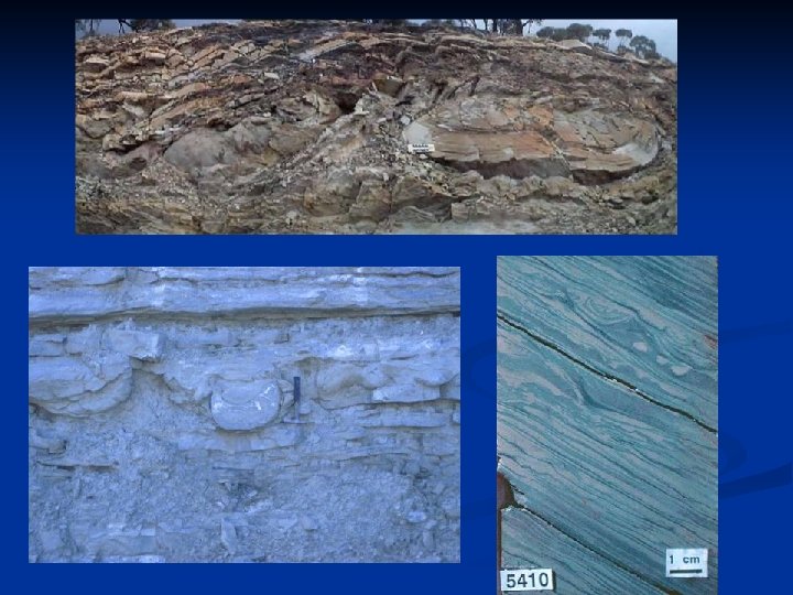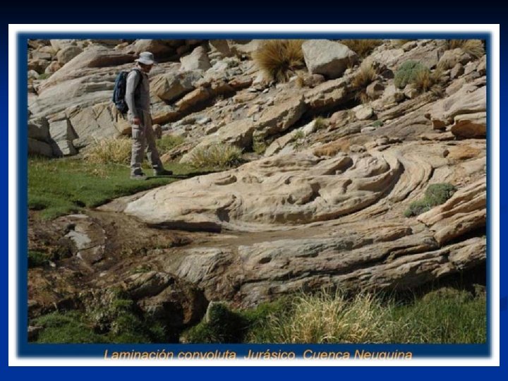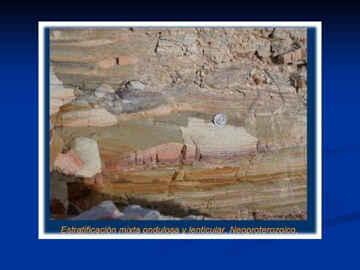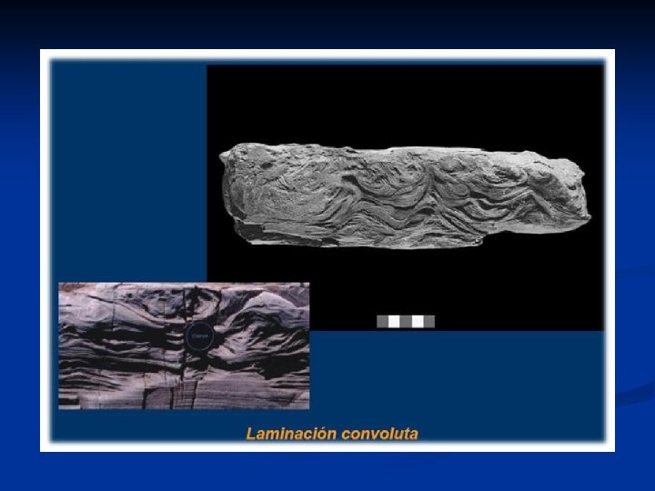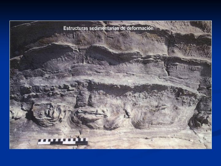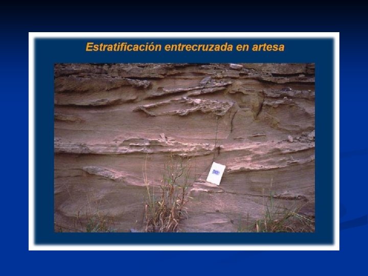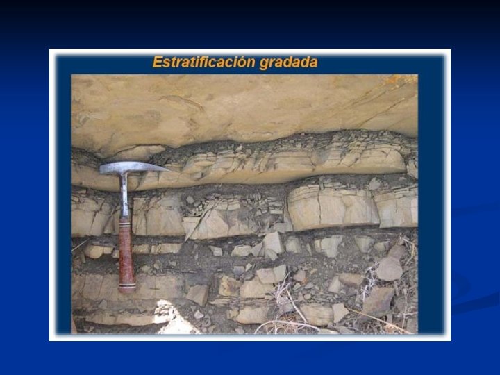 LAMINACIÓN O ESTRATIFICACIÓN CRUZADA ( CROSS BEDDING) cuando las laminas se han sedimentado con un cierto ángulo respecto a la inclinación original de la Formación, y separado de los niveles adyacentes por superficies de erosión ESTRATIFICACIÓN GRADADA ( GRADED BEDDING) consiste en la disminución progresiva del tamaño de grano, desde la parte inferior a la superior del estrato. formada por la decantación de material en suspensión a medida que decrece la velocidad de la corriente.