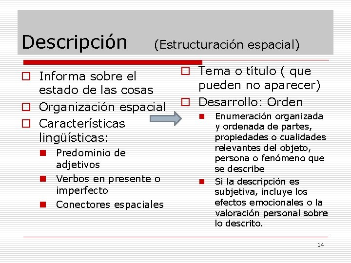 Descripción (Estructuración espacial) o Informa sobre el estado de las cosas o Organización espacial o Características lingüísticas: n Predominio de adjetivos n Verbos en presente o imperfecto n Conectores espaciales o Tema o título ( que pueden no aparecer) o Desarrollo: Orden n n Enumeración organizada y ordenada de partes, propiedades o cualidades relevantes del objeto, persona o fenómeno que se describe Si la descripción es subjetiva, incluye los efectos emocionales o la valoración personal sobre lo descrito. 14