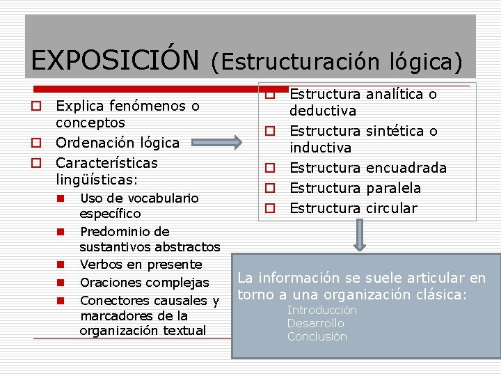 EXPOSICIÓN (Estructuración lógica) o Explica fenómenos o conceptos o Ordenación lógica o Características lingüísticas: n n n Uso de vocabulario específico Predominio de sustantivos abstractos Verbos en presente Oraciones complejas Conectores causales y marcadores de la organización textual o Estructura deductiva o Estructura inductiva o Estructura analítica o sintética o encuadrada paralela circular La información se suele articular en torno a una organización clásica: Introducción Desarrollo Conclusión