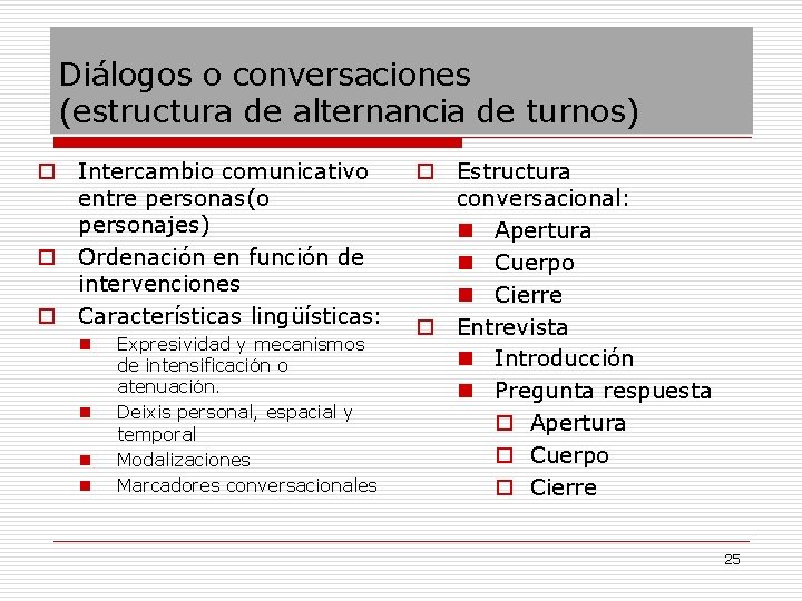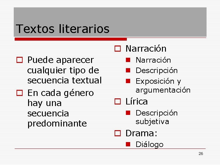 Diálogos o conversaciones (estructura de alternancia de turnos) o Intercambio comunicativo entre personas(o personajes) o Ordenación en función de intervenciones o Características lingüísticas: n n Expresividad y mecanismos de intensificación o atenuación. Deixis personal, espacial y temporal Modalizaciones Marcadores conversacionales o Estructura conversacional: n Apertura n Cuerpo n Cierre o Entrevista n Introducción n Pregunta respuesta o Apertura o Cuerpo o Cierre 25