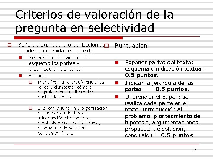 Criterios de valoración de la pregunta en selectividad o Señale y explique la organización deo las ideas contenidas en el texto: n Señalar : mostrar con un esquema las partes y organización del texto n Explicar o o Identificar la jerarquía entre las ideas y demostrar cómo se organizan en las diferentes partes del texto Explicar la función y organización de las partes del texto: introducción al problema, hipótesis o argumentaciones , propuestas de solución, conclusión final… Puntuación: n n n Exponer partes del texto: esquema o indicación textual. 0. 5 puntos. Indicar la jerarquía de las partes: 0. 5 puntos. Diferenciar el papel que realiza cada parte en el texto: introducción al problema, planteamiento de hipótesis, argumentaciones, propuesta de solución, conclusión: 0. 5 puntos 27