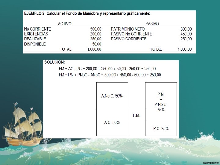 Equilibrio patrimonial 1. Equilibrio financiero total o máximo. El pasivo es cero, no hay deudas, el activo corriente y activo no corriente están financiados por el Patrimonio netov 2. Equilibrio financiero normal. FM>0, Cuando el ANC esta financiado íntegramente por el PN y PNC-LP y mismo tiempo el AC ( FM PN+PNC; resto PC) 3. Desequilibrio financiero CP FM<0, El AC esta financiado íntegramente PC, y el ANC esta financiado en parte por PC