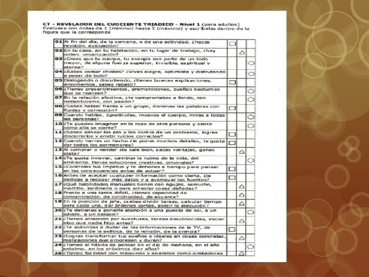 ¿ Cómo es una persona con inteligencia emocional, entrenamiento triádico? Elementos clave Identifica la sensación / emoción asociada a una situación y contexto Puede hacer explicita la estrategia mental y conciencia de pensamientos ajustados Modificando pensamientos y emociones en relación a los objetivos planteados en cada situación Objetivos que facilitan una relación con uno mismo y ecología del entorno Centramiento. Alergia de vivir Conciencia de uno mismo Flexibilidad conductual Lucidez y creatividad