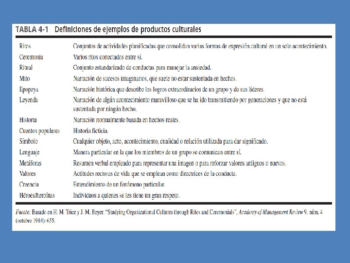 La cultura en sí misma, muy resistente al cambio representa una fortaleza o una debilidad importante para la empresa. Los productos culturales incluyen: ritos, ceremonias, mitos, epopeya, leyenda, historias, cuentos populares, símbolos, lenguaje, metáforas, valores, creencias, héroes y heroínas. La cultura es como la personalidad, ninguna empresa posee la misma cultura.