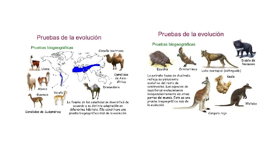 • Pruebas biogeográficas. Grupos de especies más o menos parecidas, emparentadas, que habitan lugares relacionados entre si por su proximidad, situación o características, por ejemplo, un conjunto de islas, donde cada especie del grupo se ha adaptado a unas condiciones concretas. Todas especies próximas provienen de una única especie antepasada que originó a todas las demás a medida que pequeños grupos de individuos se adaptaban a las condiciones de un lugar concreto, que eran diferentes a las de otros lugares. • Ejemplo: los pinzones de las islas Galápagos o las grandes aves no voladoras del hemisferio sur. emu casuario avestruz ñandu
