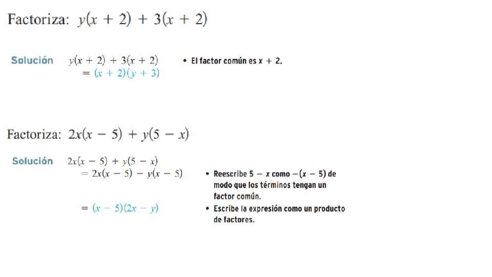 Caso 2 Factor Común por Agrupación de Términos Características y cuando aplicarlo: • Se aplica en polinomios que tienen 4, 6, 8 o más términos (siempre que el número sea par) y donde ya se ha verificado que no hay factor común (caso 1). ¿Cómo realizar la factorización? • Se forman grupos de igual número de términos, buscando que exista alguna familiaridad entre los términos agrupados (es decir, que tengan rasgos comunes). • La agrupación se hace colocando paréntesis. • ¡CUIDADO! Deben cambiarse los signos de los términos encerrados en el paréntesis si éste queda precedido por signo negativo. • Se extrae factor común de cada grupo formado (es decir, aplicamos el caso 1 en cada expresión encerrada en paréntesis). • Por último, se extrae factor común de toda la expresión (es decir, nuevamente se aplica el caso 1; en esta ocasión, el factor común es una expresión encerrada en paréntesis).