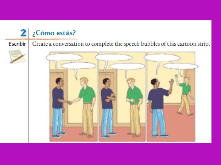 Reflexion In Spanish…. . 1. Tell a friend Good Morning. 2. Ask a friend how he or she is. 3. Say goodbye to your teacher 4. Question/Comment/Spanish Practice