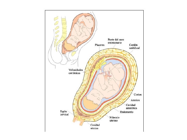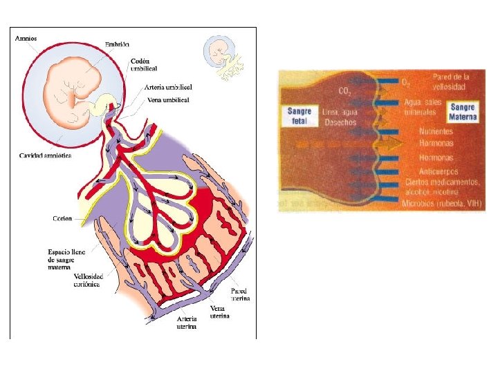 Formación de la placenta Órganos cuyos tejidos son de origen materno y embrionario. Funciones : metabólicas: intercambio nutritivo y respiratorio endocrina: secreta estrógenos, progesterona, gonadotrofina coriónica y occitocina. Capa de origen materno, la decidua y origen fetal vellosidades coriónicas, están llenas de vasos sanguíneos que confluyen en el cordón umbilical, para el intercambio entre la circulación materna y fetal, las sangres no se mezclan. La placenta queda formada al tercer mes. Después crece con el feto hasta alcanzar el sexto mes. La sangre fetal recibe agua, iones, vitaminas, glucosa, aminoácidos y ácidos grasos de la sangre materna. La placenta es un filtro selectivo que permite el paso de anticuerpos. El cordón umbilical mide 50 cm. , pasan 2 arterias y una vena. Le permite al embrión flotar libremente en el saco de líquido amniótico. El corión y el amnios son dos membranas envolventes de protección. El corión reviste toda la cavidad uterina y por dentro esta el amnios que lo tapiza todo, hasta el cordón umbilical.