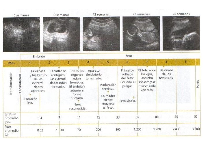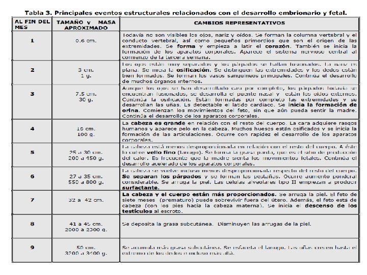 Desarrollo embrionario Período embrionario, primer y segundo mes. Desarrollo fetal Del tercer mes se habla de períodos fetal. Tercer mes: se ve alargamiento de extremidades, aparecen los riñones, se reconoce el sexo del feto.