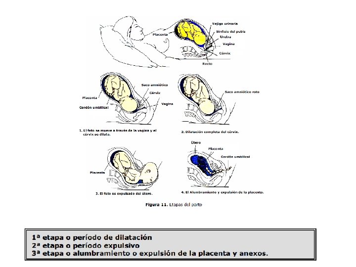 El parto incluye liberación de occitocina y prostraglandinas, que estimulan las contracciones uterinas. Durante el nacimiento el cervix o cuello uterino se dilata para permitir la salida del feto.